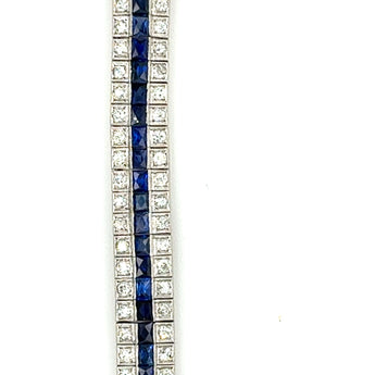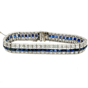 This exquisite Art Deco bracelet features 5.00 carats of round natural diamonds paired with synthetic sapphires, a nod to the 1920s when synthetic sapphires were prized above natural ones. Set in lustrous platinum, the line bracelet measures 7" long by ½" wide, offering a timeless blend of elegance and historical charm. Perfect for those who appreciate vintage beauty with a sophisticated edge.